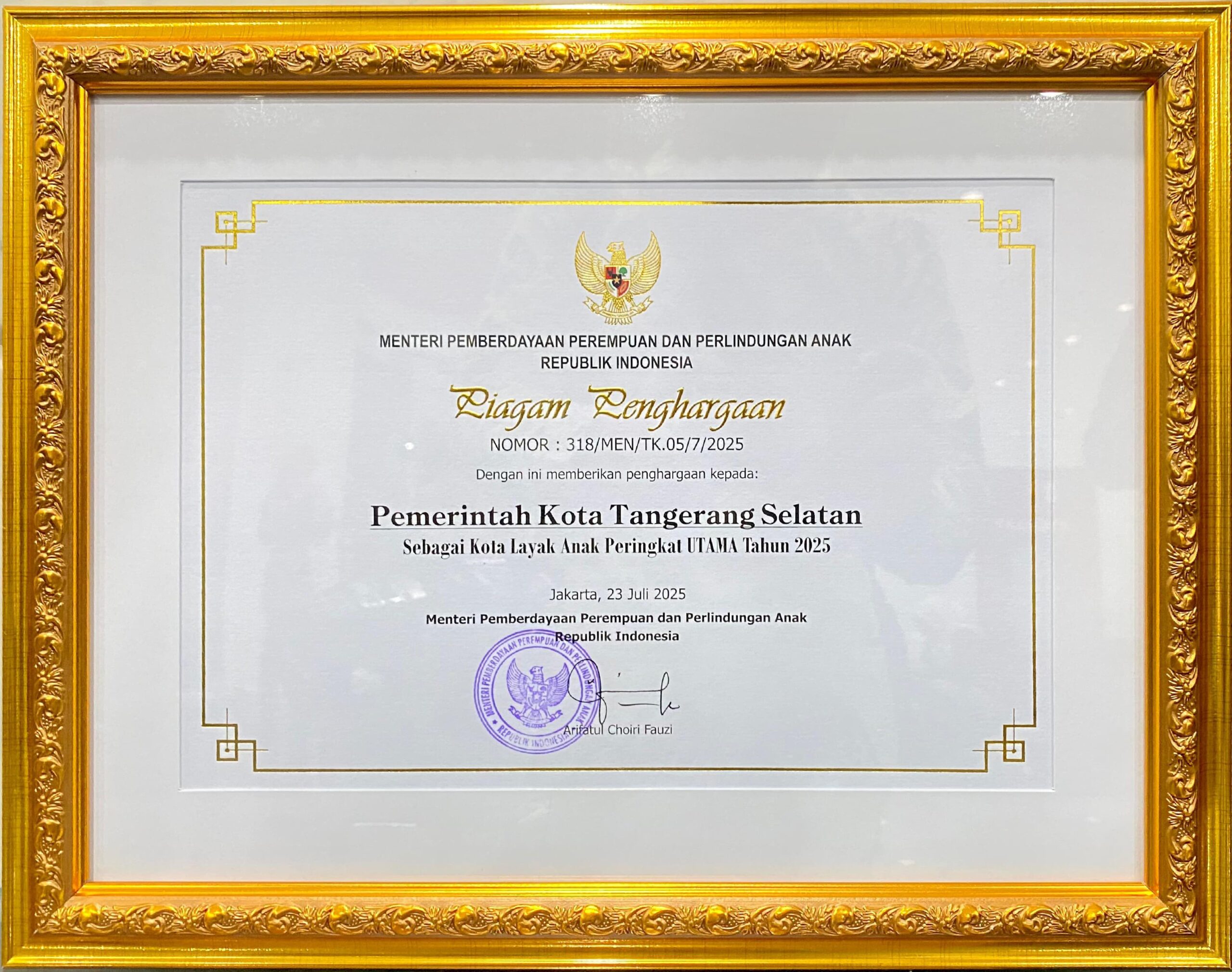 Beritatangsel.com — Kota Tangerang Selatan (Tangsel) kembali menorehkan prestasi Nasional dengan meraih piagam penghargaan Kota Layak Anak (KLA) Kategori Utama 2025 dari Kementerian Pemberdayaan Perempuan dan Perlindungan Anak (PPPA) Republik Indonesia.