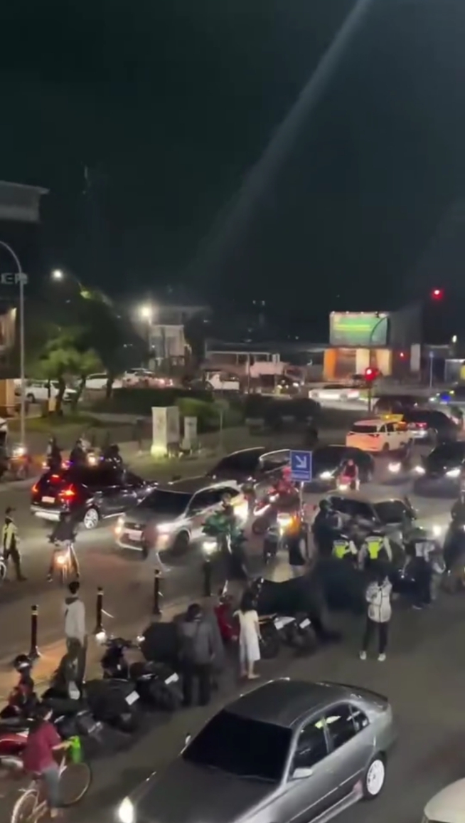 Nampak terjadi keributan pengendara sepeda motor dengan pengemudi mobil di jalan raya.