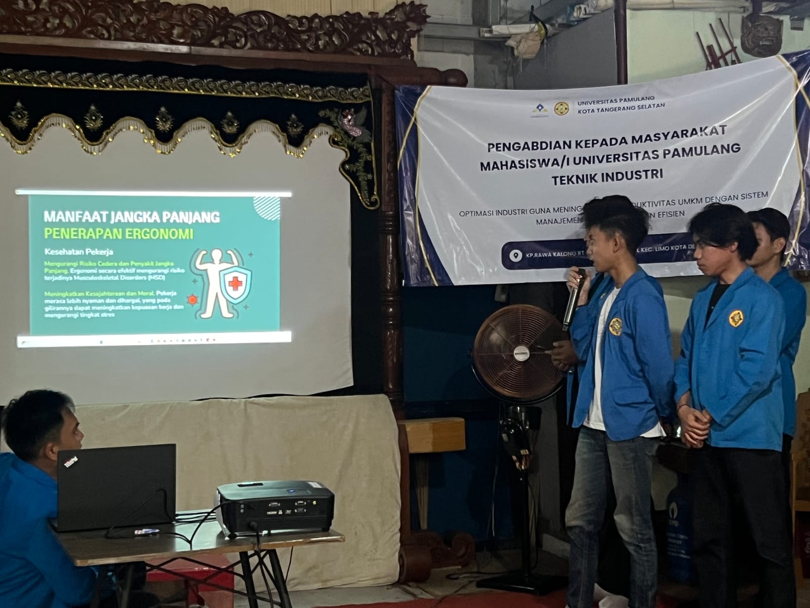 Ketua pelaksana Kelompok 4, Rifki Maulana (NIM: 231010800596), bersama anggota Omega Alfandi, Nur Maulana Saddam, Lingga Jati, Ransiscus Erens, melaksanakan program ini di bawah bimbingan Dosen Pembimbing PKM, Agus Nurokhman, S.T., M.M. Rifki menjelaskan bahwa kegiatan ini bertujuan membantu pelaku UMKM mengidentifikasi risiko ergonomi, memahami cara kerja aman, serta mendorong penerapan kebiasaan kerja yang lebih sehat dan efisien.